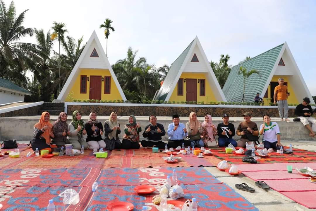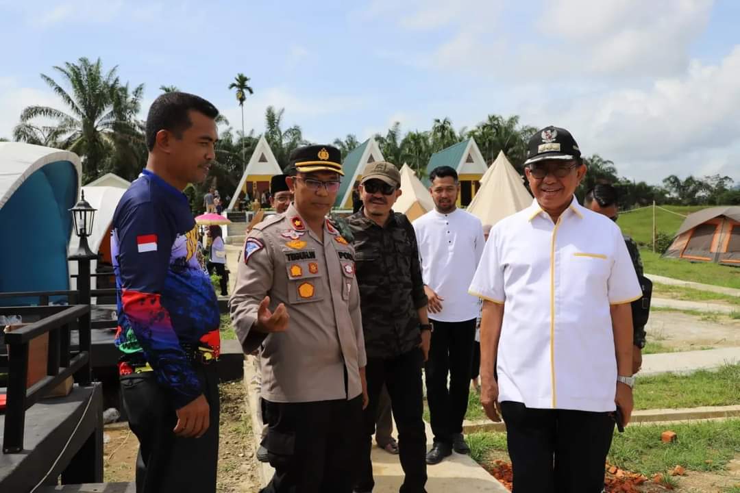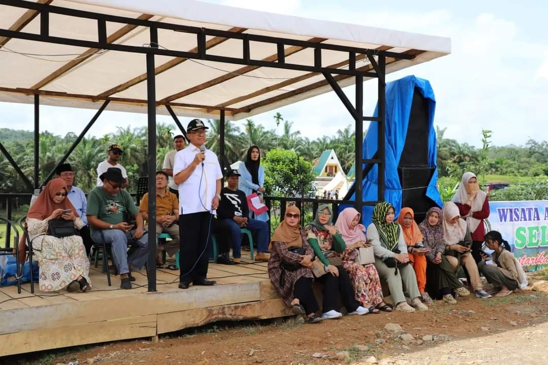 Bupati Indragiri Hilir HM. Wardan saat menghadiri soft opening wisata agro dan bumi perkemahan Selensen Point Kecamatan Kemuning, Selasa (25/4/2023).