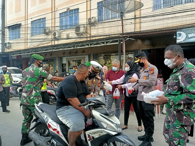 Bentuk kepedulian terhadap sesama dalam meriahkan Bulan Suci Ramadhan Polres Inhil bersama Kodim 0314/Inhil berkolaborasi dengan Yayasan Vioni Bersaudara (YVB) dan Paguyuban Sosial Marga Tionghoa (PSMTI) berbagi Takjil kepada masyarakat Tembilahan di Jalan Telaga Biru tepatnya di depan Kedai Mie Aceh Gayo Senin (4/4/22).