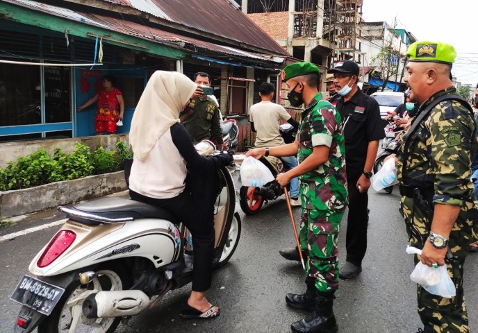 TEMBILAHAN - Kodim 0314/Inhil bersinergi dengan Pemuda Panca Marga (PPM) Indragiri Hilir (Inhil) membagikan takjil gratis kepada masyarakat yang melintas di jalan H Said, Tembilahan, Senin (25/4/22) sore.
