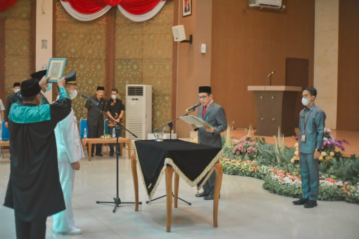 BANGKINANG KOTA - Assisten III Bidang Administrasi Umum Sekretariat Daerah Kabupaten Kampar resmi melantik dan mengambil sumpah jabatan terhadap 72 orang pejabat di lingkungan Pemerintah Kabupaten Kampar pada hari Kamis (12/05/2022) sore, kemarin, bertempat di Aula Pertemuan, Komplek Perkantoran Bupati Kampar, Jalan Panglima Khotib, Kelurahan Langgini, Kecamatan Bangkinang Kota, Kabupaten Kampar.