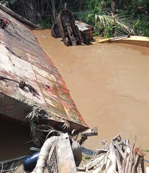 Kapolsek Reteh AKP M Rafi saat dikonfirmasi, menuturkan kronologis dari keterangan para saksi di lokasi kejadian alat berat itu mengalami kemiringan ketika akan dinaikkan ke daratan dari atas ponton.