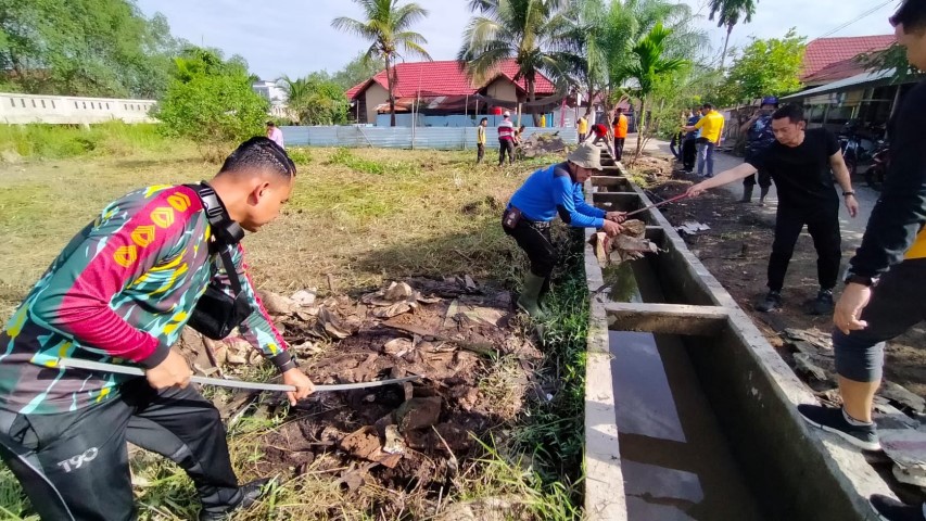 Tampak dalam kegiatan gotong royong, personil Polres Inhil jajaran bersama warga gotong royong membersihkan sampah, menguras parit dan membersihkan rumput.