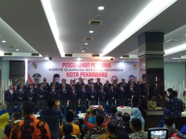 Acara pelantikan pengurus KONI Pekanbaru dihadiri oleh Sekretaris Daerah Kota Pekanbaru M Jamil, mantan Ketua DPRD Pekanbaru Hamdani, Wakil Ketua DPRD Pekanbaru Ginda Burnama, Azwendi, Novfrizal.**