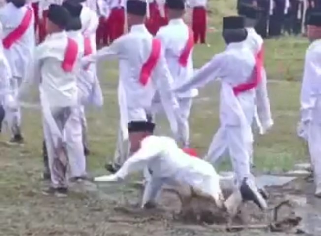 Peristiwa tersebut terjadi di halaman Madrasah Nurul Huda Desa Bekawan Dalam, Kecamatan Mandah, Kabupaten Inhil dan terekam dalam video telepon genggam milik peserta upacara, Rabu (17/8/2022).