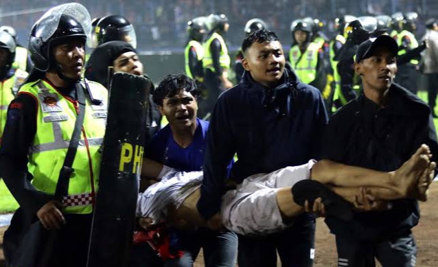 Awalnya polisi menembakkan gas air mata ke lapangan saat suporter ricuh. Polisi juga menembak ke arah tribun atas.