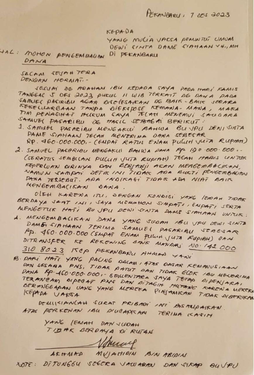 Di akhir surat itu, Akhmad Mujahidin meminta uang yang diberikan lewat perantara Samuel Pasaribu kepada JPU Dewi Sinta Dame dikembalikan kepada dirinya.
