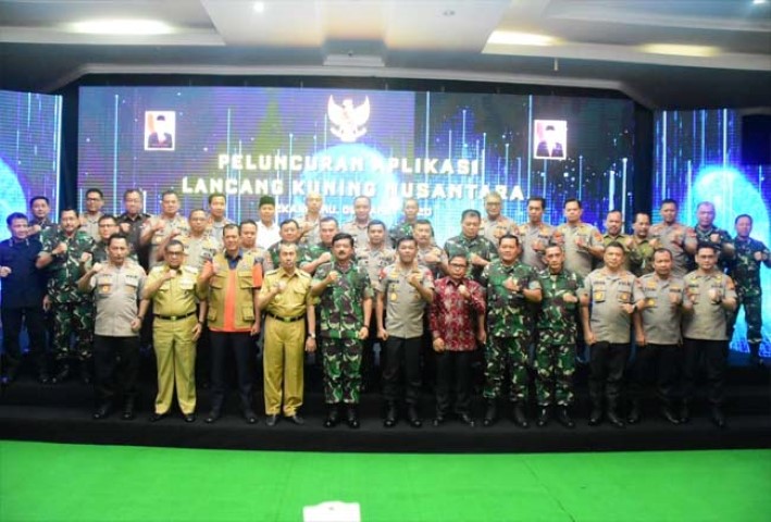 Peresmian aplikasi Lancang Kuning nusantara ditandai dengan penekanan tombol bersama, selanjutnya Panglima dan Kapolri melakukan komunikasi dengan petugas dilapangan melalui aplikasi yang baru saja di lounching. (rilis)