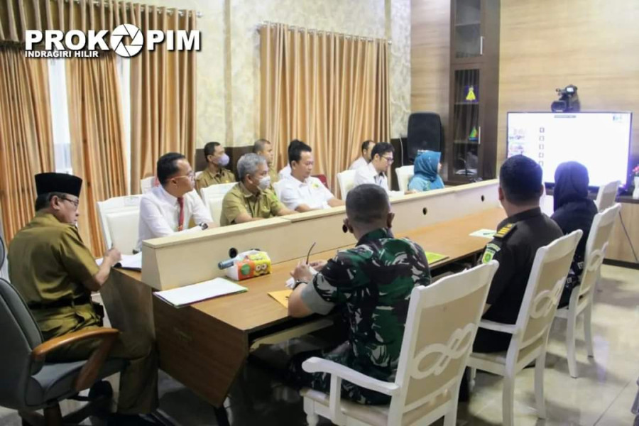 TEMBILAHAN, INDOVIZKA.COM- Bupati Indragiri Hilir H.M Wardan bersama kepala Organisasi Perangkat Daerah (OPD) terkait mengikuti rapat koordinasi (Rakor) pengendalian inflasi bersama Menteri Dalam Negeri (Mendagri) Tito Karnavian secara virtual di ruang Zoom Meating Diskominfo PS, Tembilahan, Senin (10/4/23).