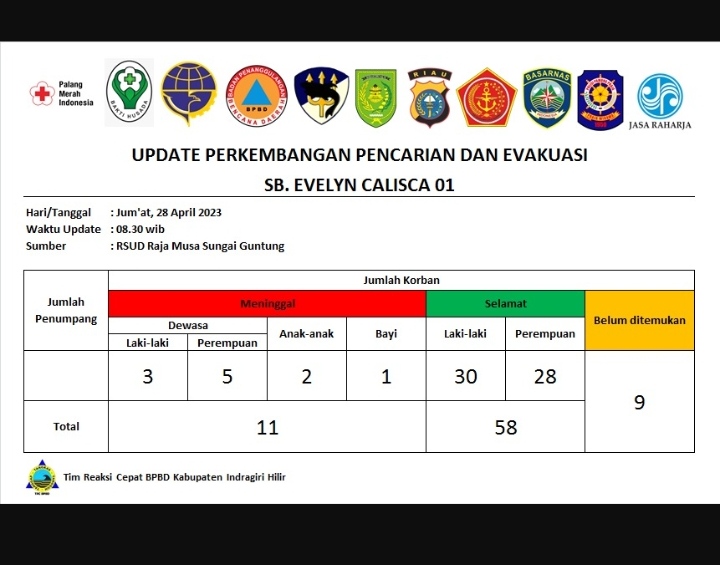 INDOVIZKA.COM - Terjadinya kecelakaan laut Kapal penumpang SB Evelin Calisca 01 di perairan Sungai Tawar Kecamatan Kateman Kabupaten Indragiri Hilir (Inhil) pada Kamis (27/4/23) menyebaban 11 orang meninggal dunia dan 9 orang masih dalam pencarian.