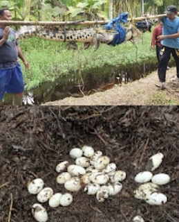 "Ada 38 butir telur yang sudah diamankan, dan induk buaya itu dievakuasi warga untuk dilepaskan lagi ke sungai, tentu kalau dibiarkan di kebun akan membuat resah warga saja," Ujar Husaini, pemilik chanel saat dihubungi via WhatsApp.