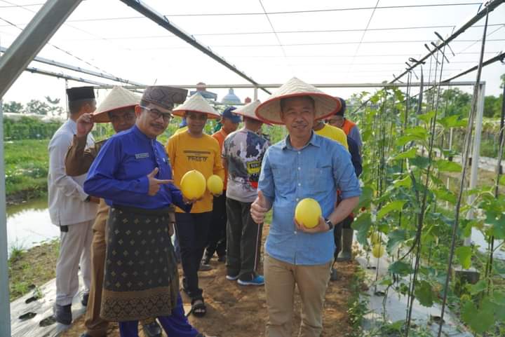 INDOVIZKA.COM - Bupati Rokan Hilir (Rohil), Afrizal Sintong melakukan panen melon kuning di Taman Edukasi Pertanian pada Selasa (1/8/2023).