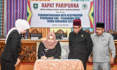INDOVIZKA.COM -Bupati Bengkalis, Kasmarni menandatangani Memorandum of Understanding (MoU) Perubahan Kebijakan Umum Anggaran dan Prioritas Plafon Anggaran Sementara (KUA-PPAS), bersama Pimpinan DPRD Bengkalis, Sofyan dan Syaiful Ardi dalam Rapat Paripurna di Gedung DPRD, Selasa (19/9/2023).