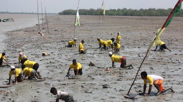 Mereka dengan lincahnya berselancar diatas papan selancar. kaki mendayung dan tangan menolak lumpur agar papan bisa diatas lumpur, disanalah pula kerang-kerang segar siap dikumpulkan.