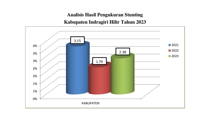 Terlihat dari grafik hasil pengukuran stunting di Kabupaten Inhil tahun 2023 mengalami penurunan dibandingkan dengan tahun 2021. Dimana pada tahun 2021 persentase balita stunting di Inhil 3,15% dan di 2023 : 2,38%, meski sebelumnya di tahun 2022 lebih rendah 1,79%.