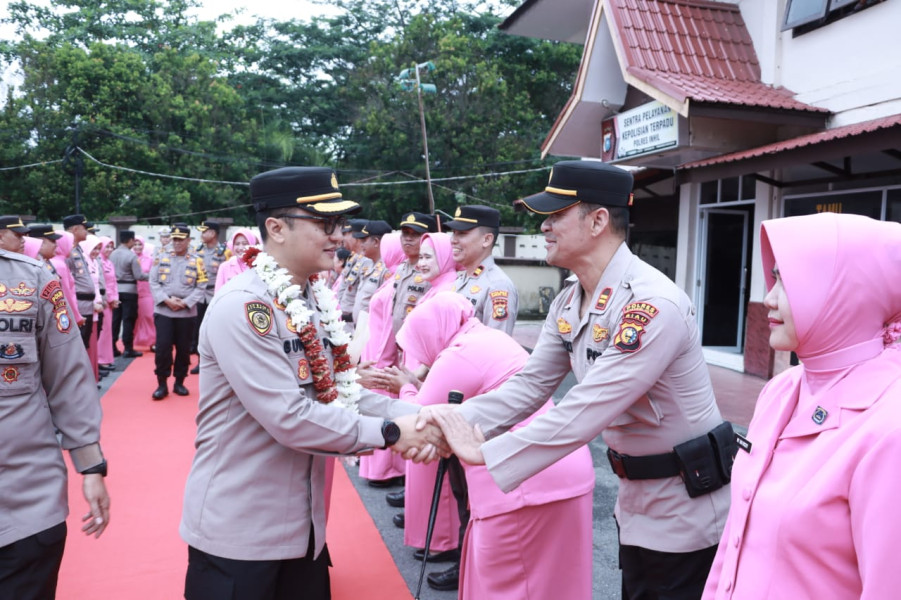 Kapolres yang baru disambut dengan tradisi pedang pora dari anggota perwira, pengalungan bunga dan pemberian bucket bunga oleh anak didik TK Kemala Bhayangkari Inhil kepada AKBP Norhayat.