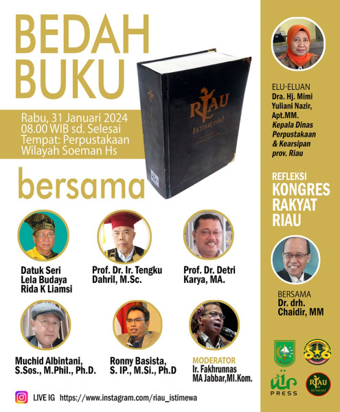 PEKANBARU, INDOVIZKA. COM- Setelah diluncurkan 1 November 2023 lalu, buku Riau Istimewa akan dibedah, Rabu (31/1/2024) pukul 8.30 WIB di Perpustakaan Soeman Hs. Selain bedah buku, akan dilaksanakan juga refleksi Kongres Rakyat Riau (KRR) bersama Dr. drh Chaidir MM.