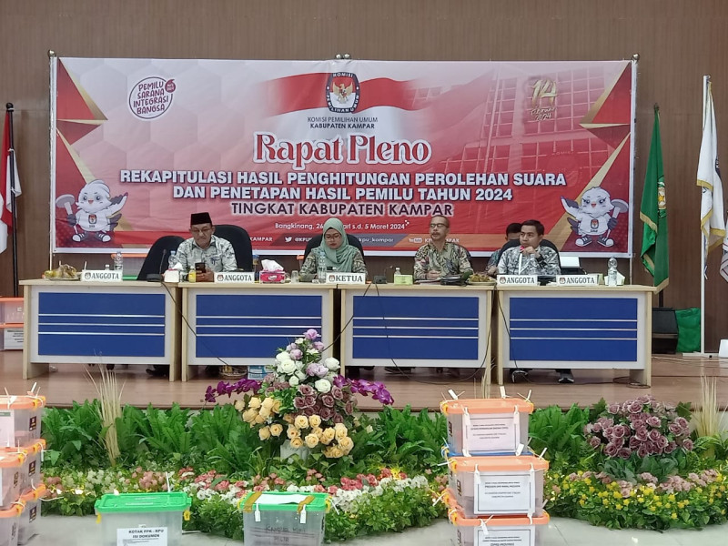 BANGKINANG KOTA - Rapat Pleno Penghitungan Perolehan Suara dan Penetapan Hasil Pemilu Tahun 2024, yang digelar oleh Komisi Pemilihan Umum (KPU) Kabupaten Kampar masih berlangsung sampai saat ini, hari Rabu (28/02/2024) malam dini hari.