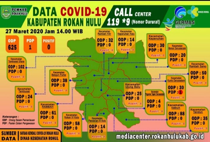 Berdasarkan informasi Bupati Rohul H Sukiman melalui Juru Bicara Gugus Tugas Pencegahan dan Penanggulangan Covid 19, Kabupaten Rohul Drs Yusmar MSi, Jumat (27/3/2020) sore kemarin mengakui, walaupun terjadi peningkatan ODP namun belum ada warga yang dinyatakan Suspek atau positif Covid-19.