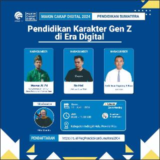 Mengusung tema ”Pendidikan Karakter Gen Z di Era Digital”, webinar untuk segmen pendidikan yang akan diikuti secara nobar oleh pelajar dari sekolah masing-masing itu rencananya menghadirkan tiga narasumber. Yakni: Widyaiswara Ahli Madya Dinas Pendidikan Provinsi Riau Marwan, musisi Rio Alief, engineer Gede Iwan Saputra, dan Fitta Mamita selaku moderator.