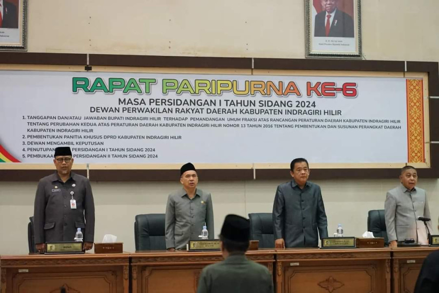 TEMBILAHAN, INDOVIZKA.COM- Dewan Perwakilan Rakyat Daerah (DPRD) Kabupaten Indragiri Hilir (Inhil) menggelar Rapat Paripurna ke-6 masa persidangan I tahun sidang 2024, dengan agenda Jawaban/tanggapan Bupati atas pemandangan umum Fraksi terhadap Rancangan Peraturan Faerah (Ranperda) Kab. Inhil tentang perubahan kedua atas peraturan daerah Kab. Inhil nomor 13 tahun 2016 tentang pembentukan dan susunan perangkat daerah kabupaten Indragiri Hilir.
