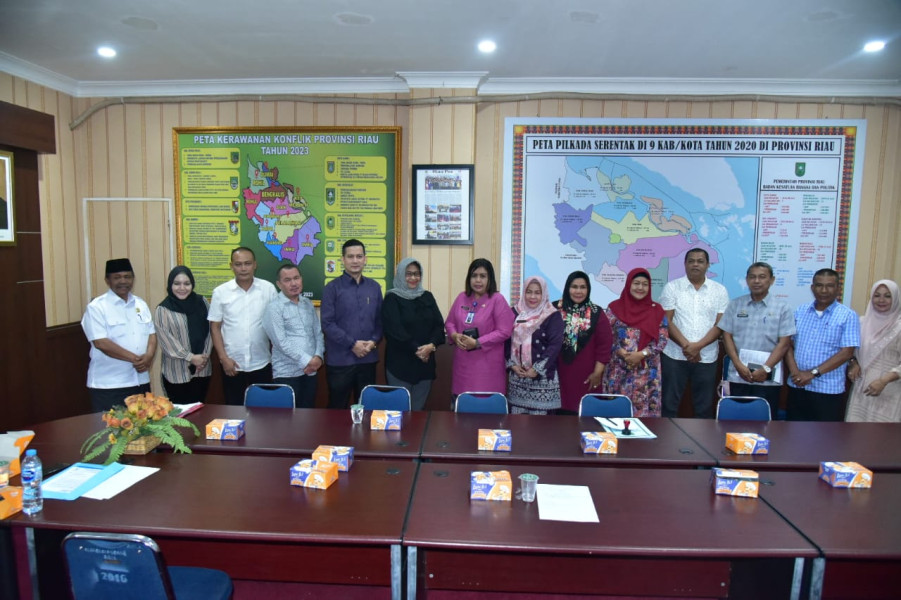 Rombongan Komisi 2 di sambut oleh Kepala Bidang Politik Dalam Negeri Linda Marlina Siagian, S. SiT, M. Sc dan jajarannya di ruang rapat Badan Kesbangpol Provinsi Riau.