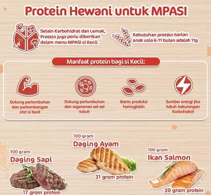 Dalam menyusun menu pendamping ASI (MPASI), penting untuk memilih sumber protein hewani yang tepat, seperti ayam, sapi, ikan, dan telur. Kombinasi variasi ini dapat memberikan berbagai jenis nutrisi yang diperlukan oleh tubuh dalam proses tumbuh kembang.