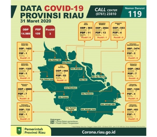 Menurut situs resmi Covid-19 Riau, data sebaran ODP Riau diantaranya Rohil ada 1.423 ODP, Rohul 1.325 ODP, Kampar 2.089 ODP, Kuansing 733 ODP, Dumai 303 ODP, Pekanbaru 444 ODP, Bengkalis 2.664 ODP, Siak 553 ODP, Meranti 3.474 ODP, Pelalawan 262 ODP, Inhil 1.226 ODP, dan Inhu 493 ODP.
