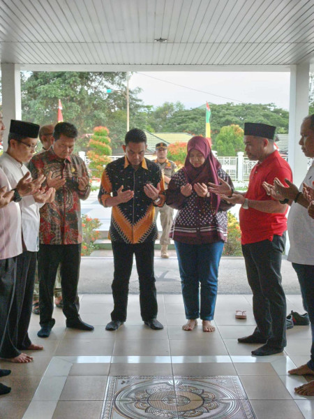 Kedatangan Pj Bupati Inhil bersama istri tersebut di sambut dengan pembacaan doa bersama oleh Pj Sekretaris Daerah, para Asisten, Staf Ahli, beberapa kepala OPD serta Kaban dan Kabag di lingkungan pemerintah kabupaten Indragiri Hilir.