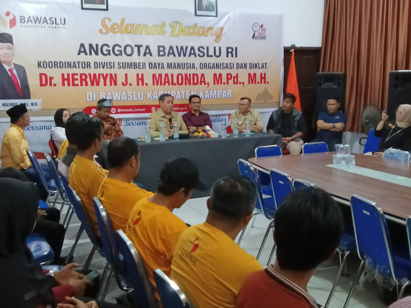 Anggota Bawaslu Republik Indonesia Dr Herwyn J H Malonda dalam sambutan dan pengarahannya di Aula Rapat, Sekretariat Bawaslu Kabupaten Kampar menyampaikan ucapan terima kasih atas sambutan terhadap dirinya dan rombongan di Bawaslu Kampar.