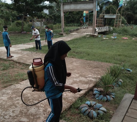 INDOVIZKA.COM- Para siswa MTs Riayadhatul Jannah Desa Sialang Panjang Kecamatan Tembilahan Hulu melakukan aksi melawan Virus Corona (Covid-19) dengan menyemprotkan cairan disinfektan di sekolahnya.