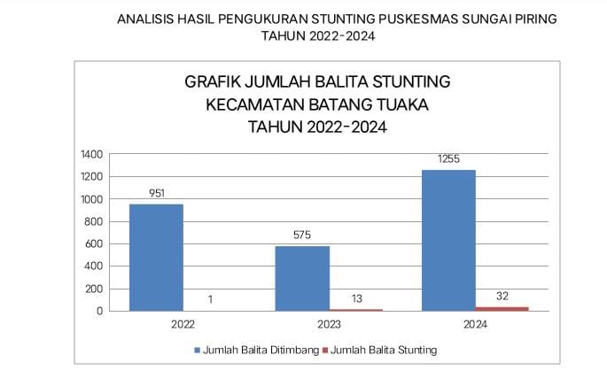 INDOVIZKA.COM - Kecamatan Batang Tuaka, Kabupaten Indragiri Hilir, Provinsi Riau, mencatat tren penurunan kasus stunting selama periode 2022 hingga 2024, menurut hasil pengukuran yang dilakukan di Puskesmas Sungai Piring dan Puskesmas Sungai Raya.