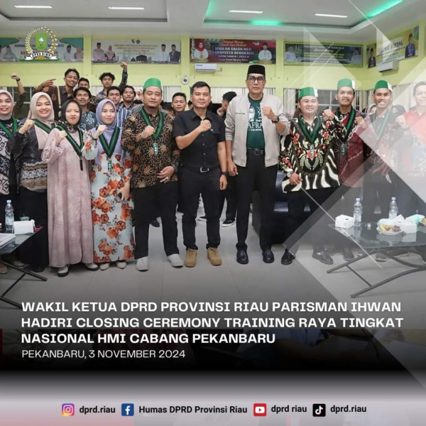 PEKANBARU, INDOVIZKA. COM- Wakil Ketua I DPRD Provinsi Riau Parisman Ihwan, hadiri Closing Ceremony Training Raya Tingkat Nasional HMI Cabang Pekanbaru, di Asrama Haji Provinsi Riau, Ahad (3/11/2024).