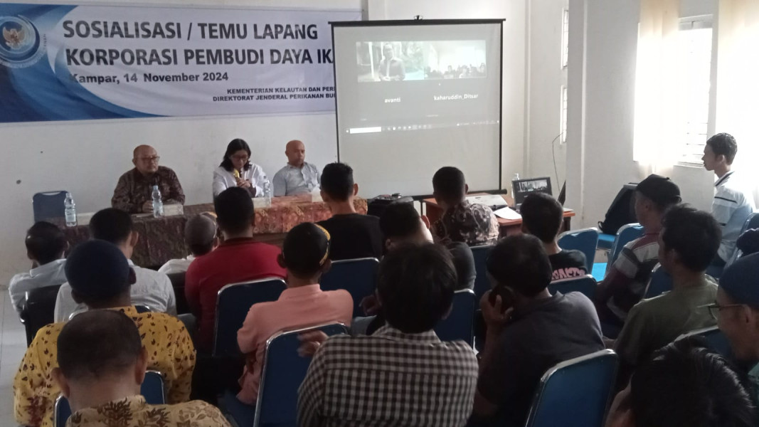 XIII KOTO KAMPAR, INDOVIZKA.COM- Kementerian Kelautan dan Perikanan melalui Direktorat Jenderal Perikanan Budidaya 2034 menggelar kegiatan Sosialisasi/Temu Lapang Korporasi Pembudi Daya Ikan di Unit Pelaksana Teknis (UPT) Usaha Produksi Hasil Perikanan, Dinas Perikanan Kabupaten Kampar, Kamis (14/11/2024) pagi.