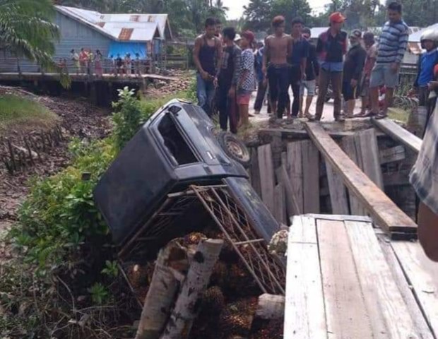Jembatan ambruk yang mengakibatkan mobil pick up jatuh ke parit ini terjadi di parit Kajang Desa Mumpa. Diketahui mobil melintas mengangkut sawit.