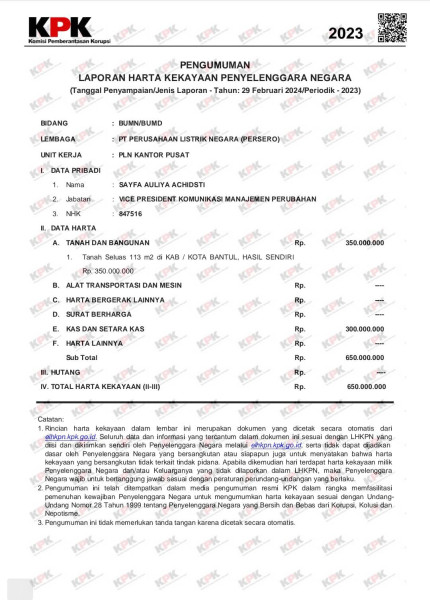 Dalam laporannya itu, tercatat harta kekayaannya sangat minim dan berbanding terbalik jika dilihat dari gaji dan apa yang diperolehnya selama di PLN. Hanya sebesar Rp650.000.000. Kekayannya itu hanya meliputi tanah seluas 113 meter persegi di Kabupaten Bantul, Yogyakarta senilai Rp350.000.000. Kemudian ada kas atau setara kas sebesar Rp300.000.000.