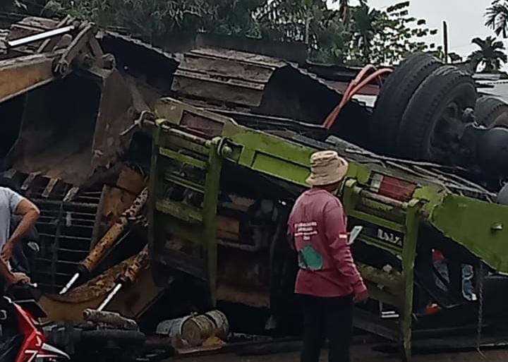 INDRAGIRI HILIR, INDOVIZKA.COM- Kecelakaan melibatkan mobil Tornado Hino bernopol BM 9155 BU yang membawa alat berat ekskavator VC135 warna kuning, serta dua sepeda motor, yaitu Honda Vario dan Honda Supra X.