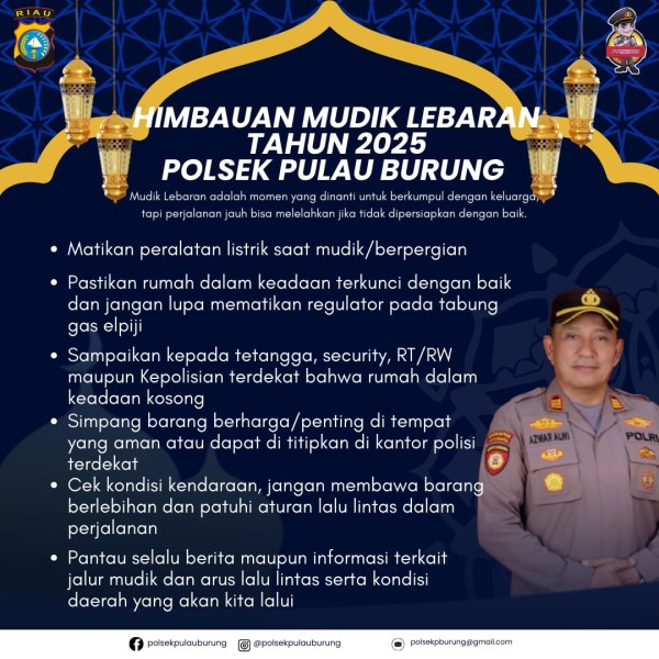"Di Pulau Burung ada banyak perantauan yang bekerja, maka itu saat raya Idul Fitri tiba, kami dari Polsek Pulau Burung telah memberikan himbauan penting bagi perantau yang akan mudik ke kampung halaman," ujar Azwar Alwi.