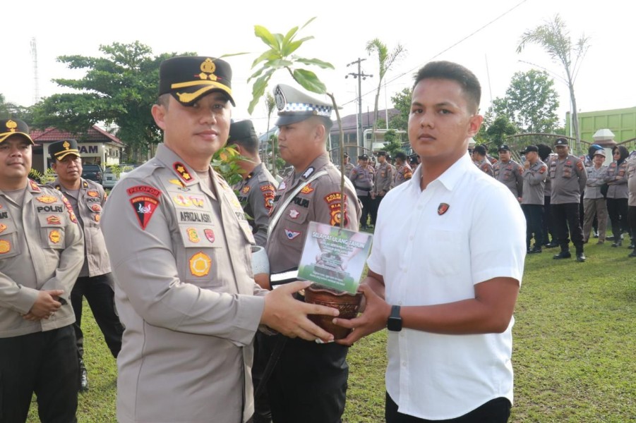 Pemberian ucapan dan hadiah ulang tahun kepada personel Polres Pelalawan dilakukan dengan memberikan bibit pohon dan melaksanakan penanaman pohon buah jenis Matoa, alpukat serta jeruk.