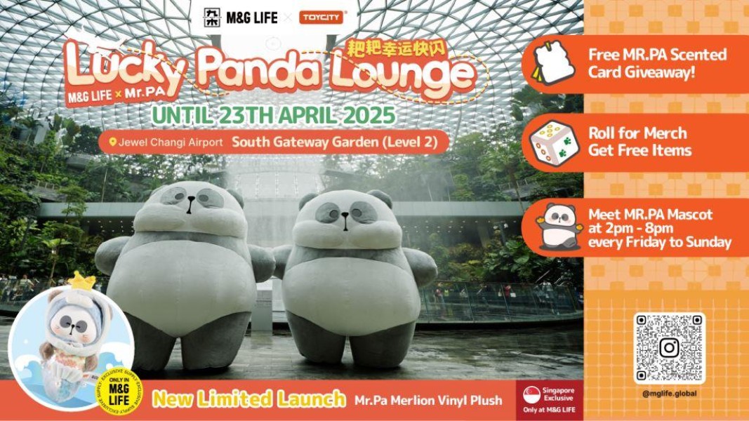 SINGAPURA - M&G LIFE, brand gaya hidup kreatif ternama, berkolaborasi dengan ikon mainan seni orisinal MR.PA dari TOYCITY menghadirkan pop-up tematik bertajuk “Lucky Panda Lounge” di South Gateway Garden, Lantai 2, Jewel Changi Airport.