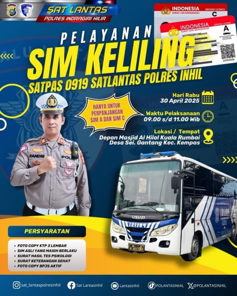 INDOVIZKA.COM – Kabar gembira bagi warga Desa Sungai Gantang, Kecamatan Kempas, Kabupaten Indragiri Hilir (Inhil). Satuan Lalu Lintas (Satlantas) Polres Inhil akan menggelar layanan SIM Keliling pada Rabu, 30 April 2025, mulai pukul 09.00 hingga 11.00 WIB.