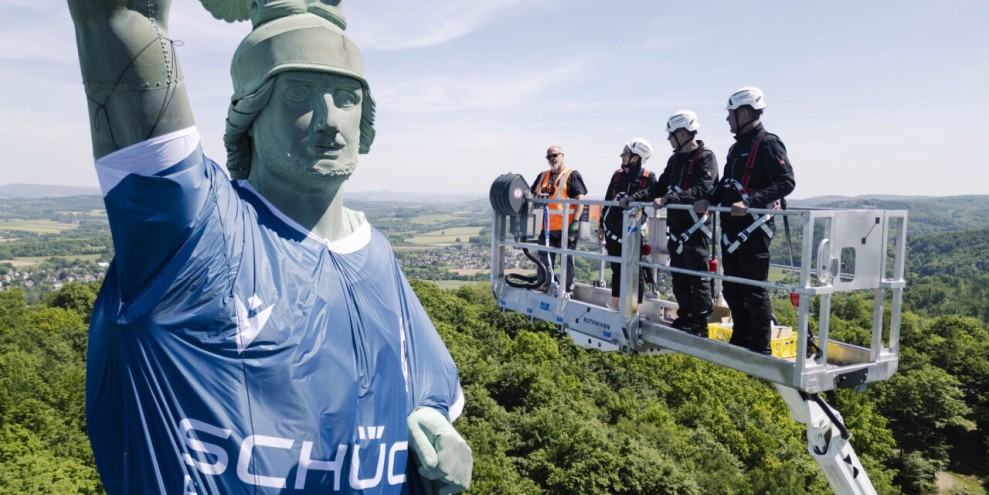 Keterangan Foto: (Fotografer: Stefan Bruckner, Hak penggunaan: Schüco International KG). Dengan tinggi total 53,46 meter termasuk landasannya, Monumen Hermann (Hermannsdenkmal) yang rampung pada tahun 1875 menjulang tinggi di atas Hutan Teutoburg. Patung figur Hermann sendiri memiliki tinggi 26,57 meter hingga ujung pedangnya, menjadikannya patung tertinggi di Jerman saat ini.