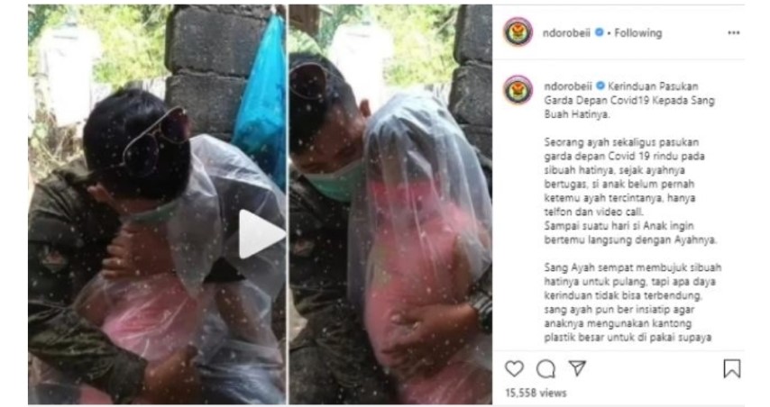 Salah satu yang membagikan ulang foto ayah yang diduga petugas COVID-19 peluk anak yang dibungkus plastik ini adalah akun Instagram @ndorobeii.