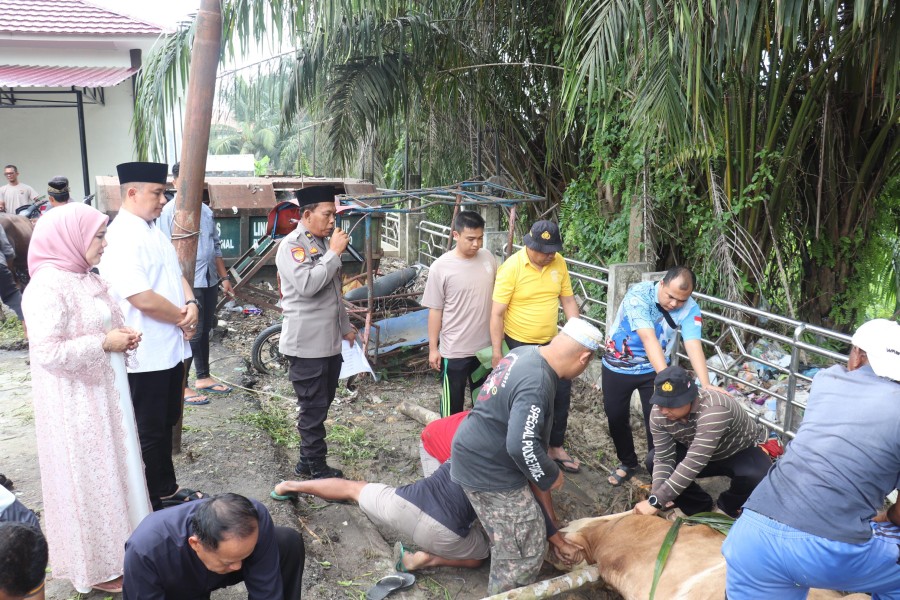 PELALAWAN,INDOVIZKA.COM-Kapolres Pelalawan AKBP Afrizal Asri SIK, didampingi istri Yatti Afrizal menyaksikan proses pemotongan hewan qurban Polres Pelalawan. Jumat (6/6/2025) di lapangan praktek SIM Satlantas Polres Pelalawan. Polres Pelalawan di hari Raya Idul Adha 1446 H/2025 M, memotong sebanyak 11 ekor Sapi qurban, dagingnya dibagikan untuk masyarakat Pangkalan Kerinci.
