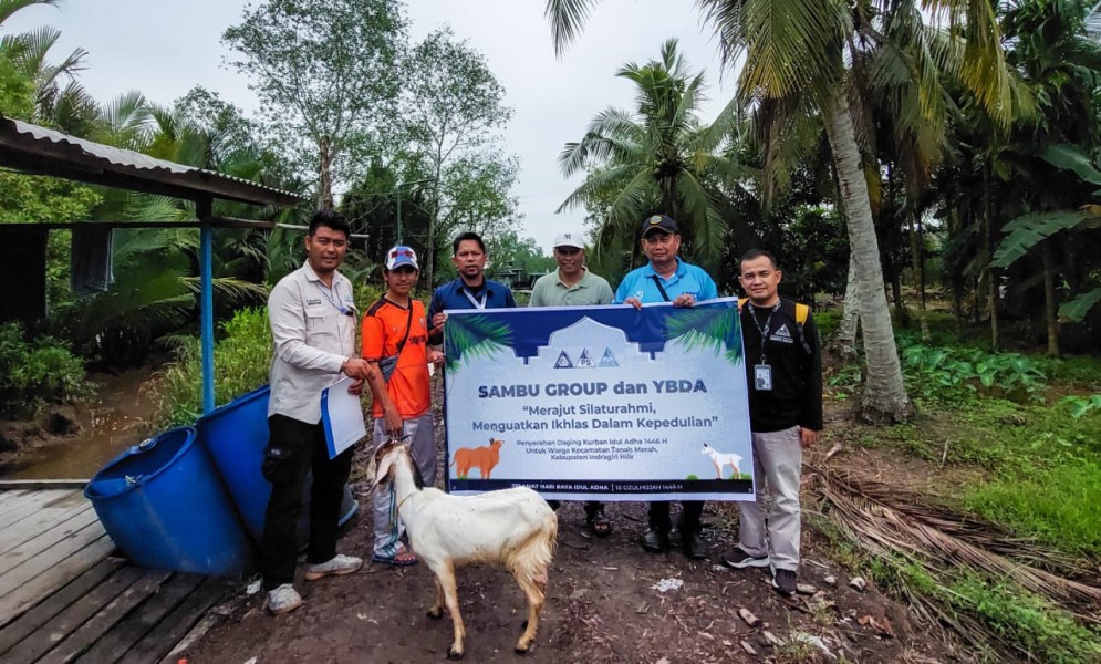 INDOVIZKA.COM - Dalam semangat Hari Raya Iduladha 1446 H, Sambu Group melalui unit bisnisnya di Kecamatan Tanah Merah, yaitu PT Pulau Sambu di Kuala Enok, bersama Yayasan Bahtera Dwipa Abadi kembali menyalurkan hewan kurban untuk masyarakat sekitar. Tahun ini, Sambu Group menyalurkan 7 ekor kambing ke berbagai wilayah, termasuk Desa Tekulai, Enok, Pengalehan, Tanah Merah, Tanjung Lajau, Tembilahan Hulu, dan lainnya.