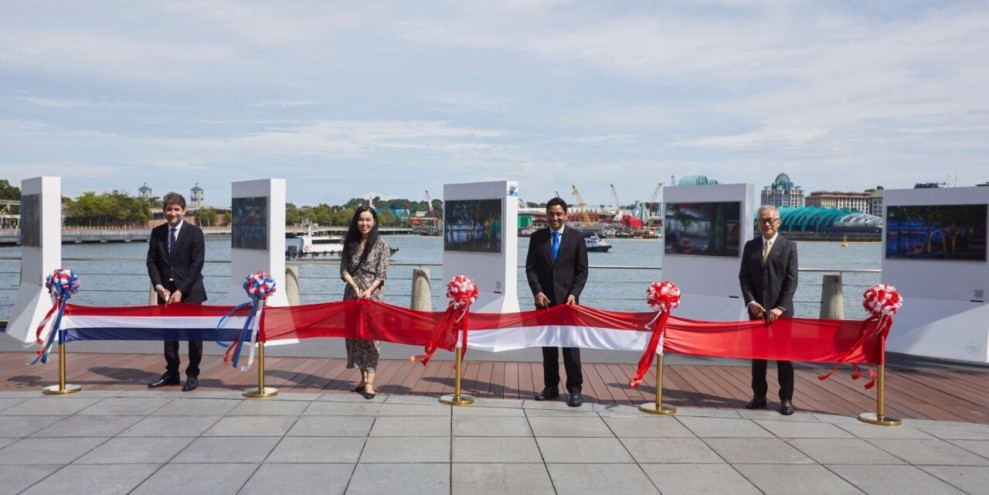 Keterangan Foto: (Dari kiri) Yang Mulia Mr Stephen Marchisio, Duta Besar Prancis untuk Singapura; fotografer Melisa Teo; Mr Dinesh Vasu Dash, Menteri Negara untuk Kebudayaan, Komunitas dan Kepemudaan, serta Tenaga Kerja, selaku tamu kehormatan; dan Mr Edmund Cheng, Ketua Mapletree saat seremoni pemotongan pita pameran fotografi Two Rivers (Bagian II) di Promenade tepi laut VivoCity.