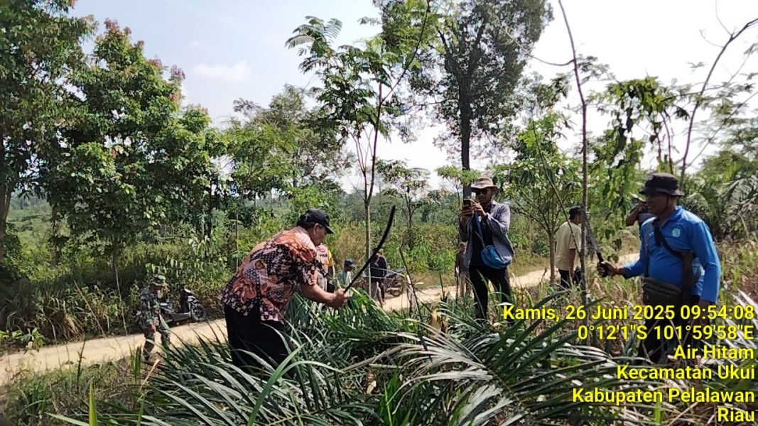 PELALAWAN,INDOVIZKA.COM-Kepala Desa Air Hitam Kecamatan Ukui Tensi Sitorus bersama pemilik kebun dan didampingi Satgas PKH lakukan pemusnahan pokok sawit yang berumur dibawah 5 tahun. Kamis (26/6/2025), di Kawasan TNTN Desa Air Hitam.Seluas 10 Hektare lahan sawit yang berumur dibawah 5 tahun dipimipin langsung oleh Kepala Desa Air Hitam beserta perangkat Desa dan Pemilik Kebun.