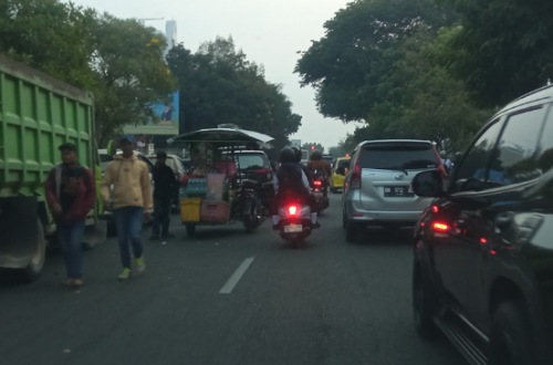 Akibat penumpukan massa di sekitar Kantor Gubernur Riau membuat arus lalu lintas di Jalan Sudirman sekitar Bundaran Tugu Zapin mulai macet.