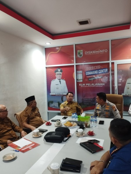 Kegiatan zoom meeting berlangsung di Command Center Kantor Bupati Pelalawan dan turut dihadiri oleh Asisten I Setda Zulkifli, S.Ag., Kepala BPBD Zulfan, serta Kapolres Pelalawan AKBP Jhon Louis Letedara, S.I.K.