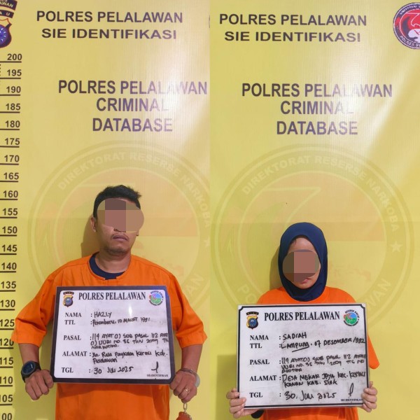 Tim Opsnal Sat Resnarkoba Polres Pelalawan melakukan penyelidikan dan menemukan dua orang mencurigakan. Kedua tersangka ditangkap sedang duduk dipinggir jalan Raja. Kemudian dilakukan interogasi tersangka laki-laki mengaku berinisial Hazly(34) dan perempuan Sadiah (33).