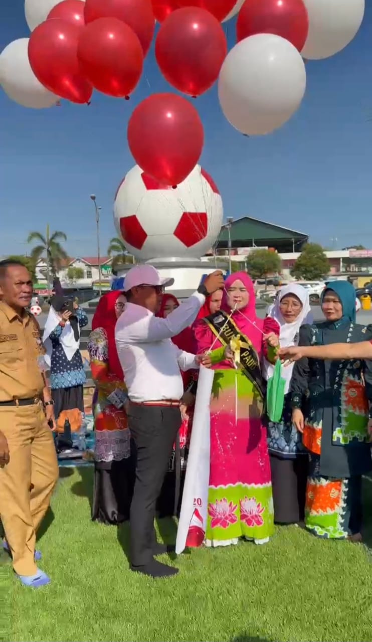 Sebagai tanda dimulainya perayaan, Bupati Pelalawan bersama Bunda PAUD Kabupaten Pelalawan melepas balon ke udara, yang disambut tepuk tangan meriah peserta dan tamu undangan.